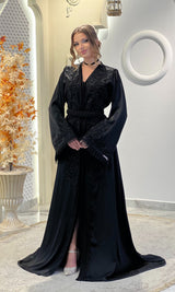 Design : Silhouette en crêpe noir profond avec ceinture sculptée