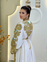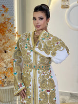 Alice capture la splendeur de la haute couture marocaine, un chef-d'œuvre d'élégance, d'opulence et de charme intemporel. Drapée de crêpe blanc lumineux et ornée de broderies dorées délicates, rehaussées de touches d'émeraude et de rubis, elle évoque la grâce d'un héritage royal et une féminité raffinée.