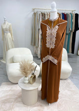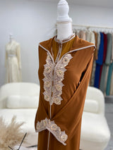 Narjis allie la richesse de sa teinte caramel chaude à de délicates broderies florales qui confèrent à la pièce un raffinement absolu. Confectionnée en crêpe souple et fluide, elle épouse gracieusement les formes tout en offrant le confort et la pudeur d'une silhouette marocaine classique.