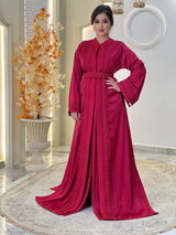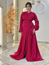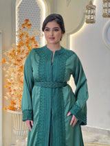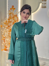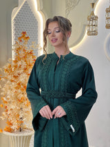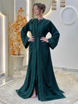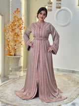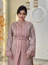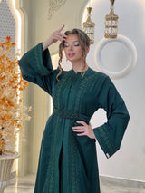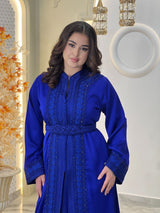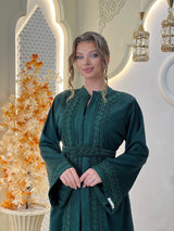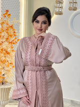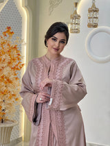 La lebsa Mirélia incarne le charme de la sophistication marocaine, un hommage à une féminité intemporelle empreinte d'un raffinement discret. Son crêpe luxueux drape avec une grâce sereine, tandis que ses broderies ton sur ton complexes révèlent la poésie d'un savoir-faire artisanal.