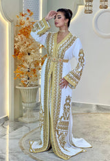 Design : Confectionnée en crêpe de qualité supérieure, la silhouette fluide allie une structure royale à un mouvement délicat. Ornée de broderies de fil d'or et de perles fines, elle capture l'art de la haute couture marocaine traditionnelle avec une touche de modernité.