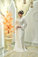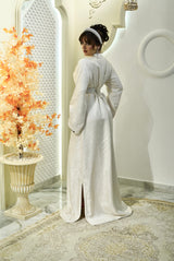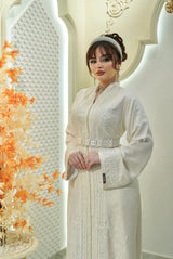 Yasma incarne l'élégance à l'état pur, une création qui s'exprime sans excès. Confectionnée dans un tissu doux au subtil motif tissé, elle rayonne de sérénité et d'harmonie. Des broderies ton sur ton parcourent l'ensemble, sublimant la silhouette d'une sophistication discrète.