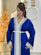 This kaftan embodies profound and radiant elegance, where rich royal blue meets the opulence of golden embroidery, offering a presence that is both confident and serene, elevated by exquisite detailing and refined craftsmanship.