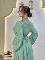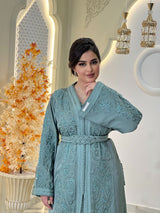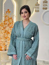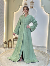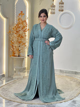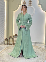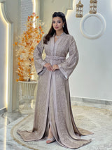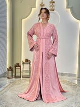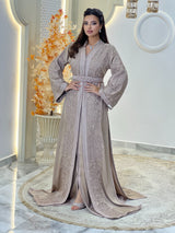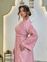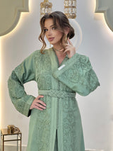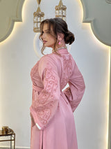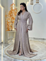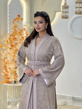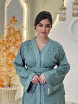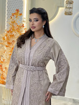 Confectionnée en crêpe fluide et brodée de fins fils de soie, cette robe révèle le savoir-faire discret de la haute couture marocaine. La ceinture tressée à la main souligne la silhouette avec une délicatesse précise, tandis que les détails en sfifa parachèvent l'ensemble d'une élégance intemporelle.