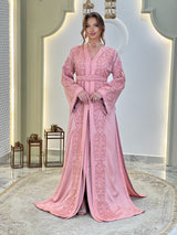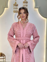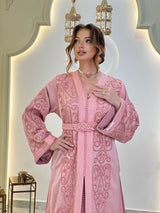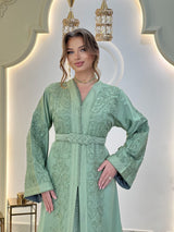 Dans le Takchita Mitra , des nuances de rose et de sauge s'entremêlent en une harmonie poétique, une création qui incarne la sérénité par le contraste. Ses deux tonalités évoquent la douce rencontre de l'aube et de la brume du jardin, calme, lumineuse et d'une délicatesse absolue.