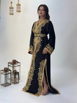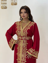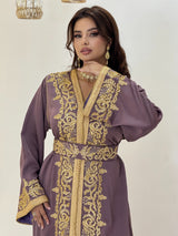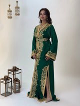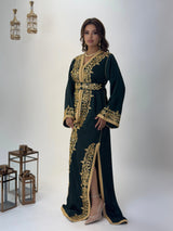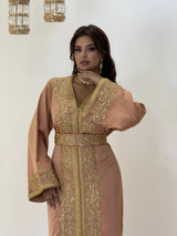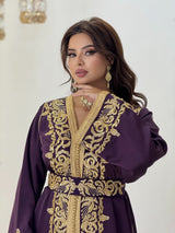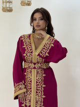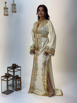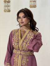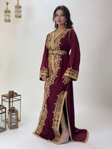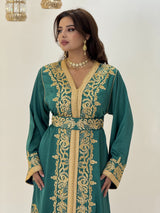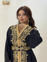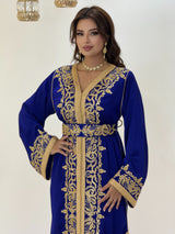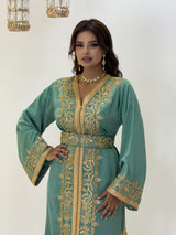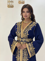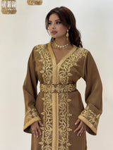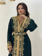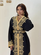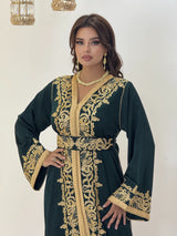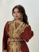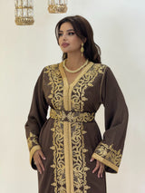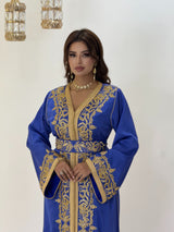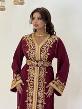 Haute couture en Drap de Soie, ornée de broderies Rbati traditionnelles et de pierres serties à la main. Un vêtement conçu non pas pour suivre les tendances, mais pour les définir, pour les femmes qui portent l'élégance comme une signature.