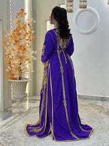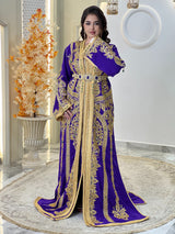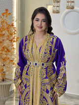 Le caftan Juliet se distingue par son intensité royale, où un violet profond rencontre l'éclat sculpté de l'or. D'une présence à la fois audacieuse et d'une grâce exquise, il est conçu pour une femme qui se meut avec une élégance assurée et laisse la couleur et la lumière s'exprimer avec une force intemporelle.