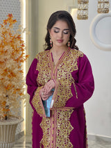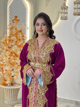 Le caftan Olivia dégage une grâce vibrante et lumineuse, où un magenta profond se déploie sous l'éclat sculpté de l'or. Sa présence est à la fois assurée et douce, créée pour une femme dont l'élégance s'exprime par des tons chauds et une beauté intemporelle et sereine.