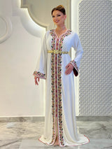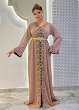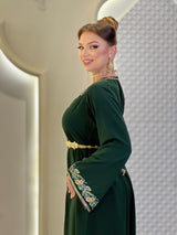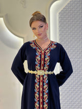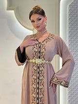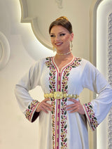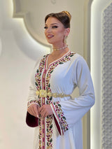 Le caftan Sabrines, à la silhouette légère et aérienne, est orné d'une délicate broderie florale qui tombe gracieusement sur toute la pièce, créant un équilibre parfait entre simplicité et sophistication. Sur la broderie, de magnifiques perles appliquées à la main rehaussent chaque détail, ajoutant un éclat subtil et élégant. Une pièce alliant art et élégance, idéale pour les grandes occasions où la distinction est à l'honneur.