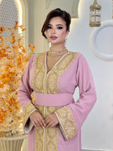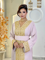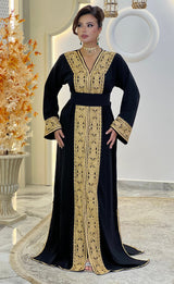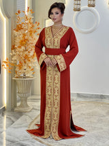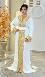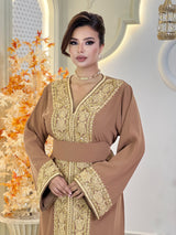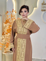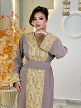 Un caftan raffiné confectionné dans une crêpe de qualité, mettant en valeur une broderie à la main méticuleuse avec des détails en cordon fins pour un look distingué et élégant.