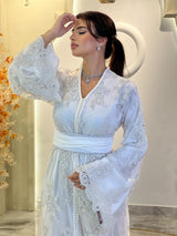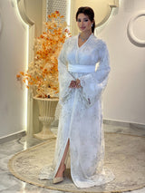 Razan incarne la pureté d'une élégance intemporelle. Confectionné en crêpe blanc lumineux, chaque motif argenté évoque sérénité et raffinement – une douce symphonie de lumière et de grâce.