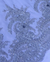 Conception : confectionnée à partir de fines couches de crêpe et de tulle translucide, ornée de broderies argentées délicatement réalisées à la main et de subtiles touches de cristal qui capturent l'essence de la haute couture moderne.