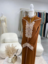 Narjis allie la richesse de sa teinte caramel chaude à de délicates broderies florales qui confèrent à la pièce un raffinement absolu. Confectionnée en crêpe souple et fluide, elle épouse gracieusement les formes tout en offrant le confort et la pudeur d'une silhouette marocaine classique.