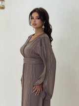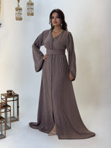 Née d'un crêpe raffiné, Malika porte l'autorité discrète d'une élégance intemporelle. Ses broderies verticales de cristaux affinent la silhouette avec une brillance feutrée, honorant une présence qui ne demande pas à être vue – elle est simplement mémorable.
