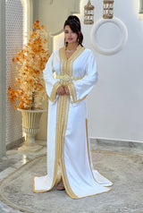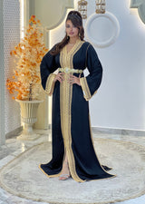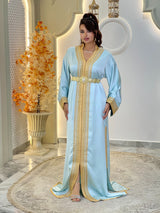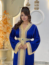 This kaftan embodies profound and radiant elegance, where rich royal blue meets the opulence of golden embroidery, offering a presence that is both confident and serene, elevated by exquisite detailing and refined craftsmanship.