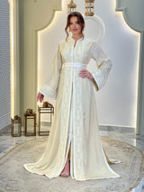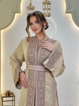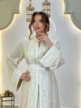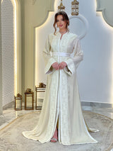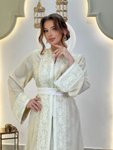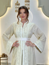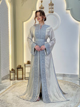 Chaque ligne de broderie épouse la silhouette avec une précision discrète, encadrant l'encolure, les manches et la ceinture dans une harmonie parfaite. La surface satinée scintille délicatement à chaque mouvement, créant un dialogue entre la lumière, le tissu et la forme.