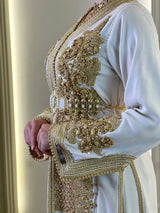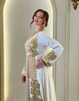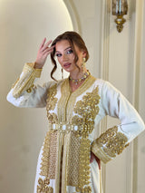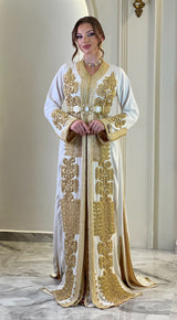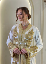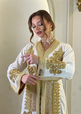 Cette takchita en crêpe raffiné est magnifiquement ornée de broderies entièrement réalisées à la main, sublimées par des ornements inspirés des plus grands codes de la haute couture traditionnelle. Le contraste lumineux du tissu ivoire et des détails dorés confère une élégance royale, tandis que la silhouette fluide sublime le savoir-faire artisanal de chaque point. Les manches larges apportent équilibre et splendeur, complétées par une ceinture artisanale qui sublime la silhouette avec majesté et sophistication.